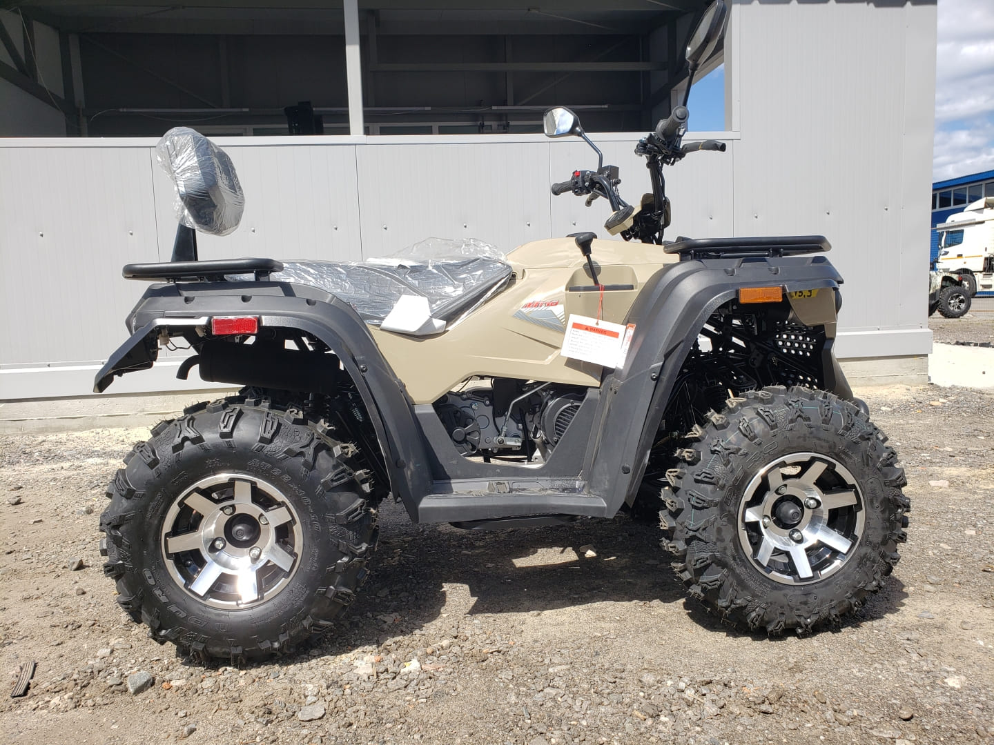 Квадроцикл оборудован четырехтактным двигателем, трансмиссией вариаторного типа с передачей заднего хода, большими 12-дюймовыми колесами, внедорожными шинами с развитыми грунтозацепами.