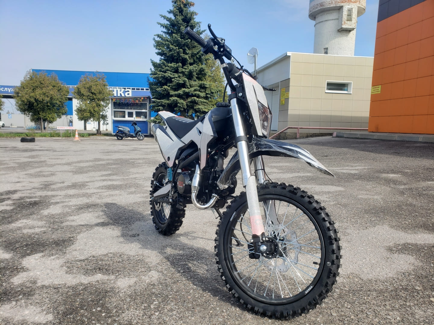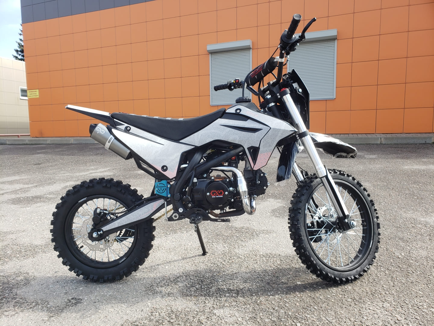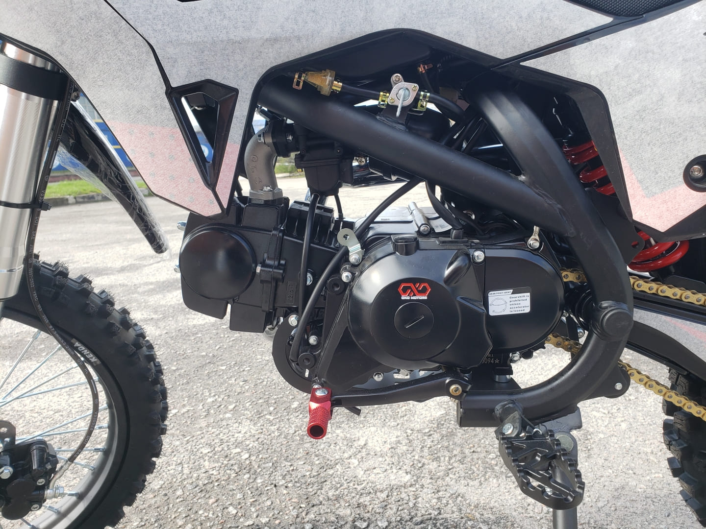 Рама: хроммолибденовая сталь, резина KENDA(70/100-17,90/100-14), бак 4л, воздушно-маслянное охлаждение, маятник стальной, обода стальные, ступица алюминиевая, спицы(3.5/3.5мм), буксатор зад, алюминиевый руль с перекладиной, пульт света КТМ, короткоходная ручка газа, алюминиевая лапка КПП, откидные алюминиевые рычаги, приборная панель, перо 33мм. Зажигание- электрический и кик стартер